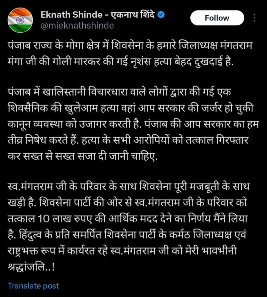 उपमुख्यमंत्री एकनाथ शिंदे यांनी या घटनेबद्दल दु:ख व्यक्त केलं आहे. ‘पंजाब राज्याच्या मोगाचे शिवसेनेचे जिल्हाध्यक्ष मंगतराम मंगा यांची गोळ्या झाडून अत्यंत क्रूरपणे हत्या करण्यात आली. ही खूप दु:खद घटना आहे. पंजाबमधील खलिस्तानी समर्थक लोकांनी एका शिवसैनिकाची खुलेआम हत्या केली. ही घटना पंजाब सरकारच्या जर्जर झालेल्या सरकारी व्यवस्थेला समोर आणते. पंजाबमधील आप सरकारचा आम्ही तीव्र निषेध करतो. या हत्येमधील सर्व आरोपींना लवकरात लवकर अटक करून त्यांना शिक्षा झाली पाहिजे.
