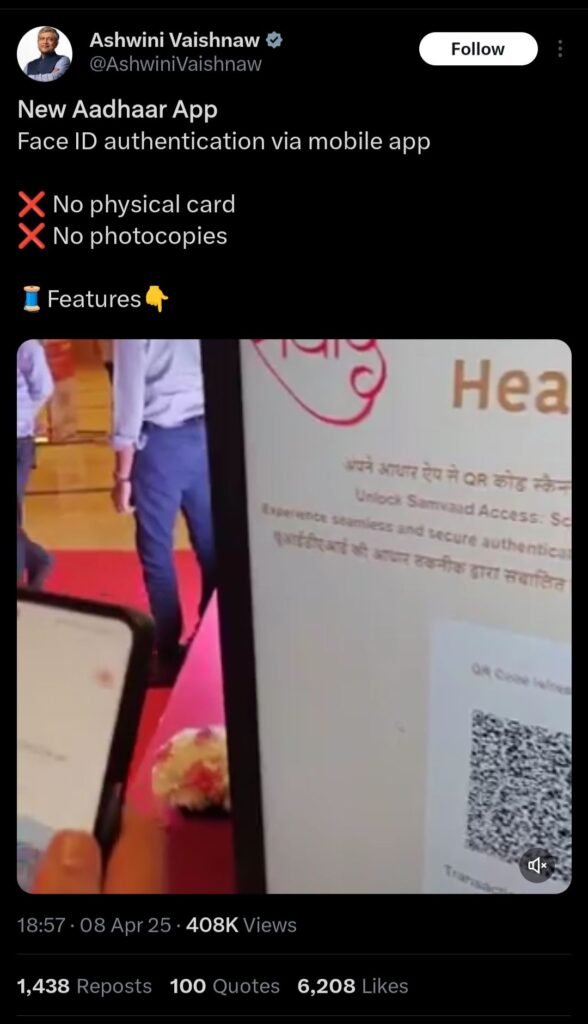 माहिती आणि प्रसारणमंत्री अश्विनी वैष्णव यांनी एक व्हिडीओ शेअर केला आहे. या व्हिडीओत फेस आयडी ऑथेंटिफिकेशनबाबात माहिती दिली आहे. फेस आयडी ऑथेंटिफिकेशनसाठी आता आधार कार्डची सॉफ्ट कॉपी किंवा हार्ड कॉपी लागणार नाही. ज्या पद्धतीन यूपीआयच्या मदतीने आर्थिक व्यवहार केले जातात. त्याच पद्धतीने आधारची पडताळणी करू शकतो. त्यासाठी फक्त तुमच्याकडे स्मार्टफोन असणे मात्र गरजेचे आहे.